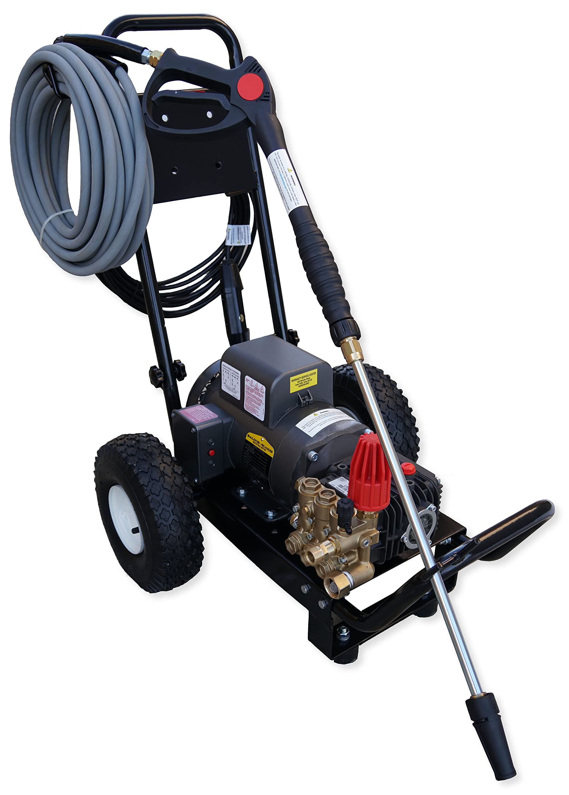 Details: 1000XS Features: -Triplex plunger pump with ceramic plungers and stainless steel valves. -Non-marking pressure hose. -With ground fault interrupter. -Adjustable pressure. -Powder-coated tube cart. -Three Gallon chemical tank. Pressure Washer Type: -Cart mounted. Material: -Metal. Generic Specifications: -Engine: 1.5 HP. -Volts: 120 volt / 15 amp. Dimensions: Overall Height - Top to Bottom: -36". Overall Width - Side to Side: -21.5". Overall Depth - Front to Back: -30". Overall Product Weight: -83 lbs.