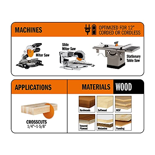• Cut solid wood, melamine, laminates, plywood, chipboard. Use on radial arm/miter saws, table saws.