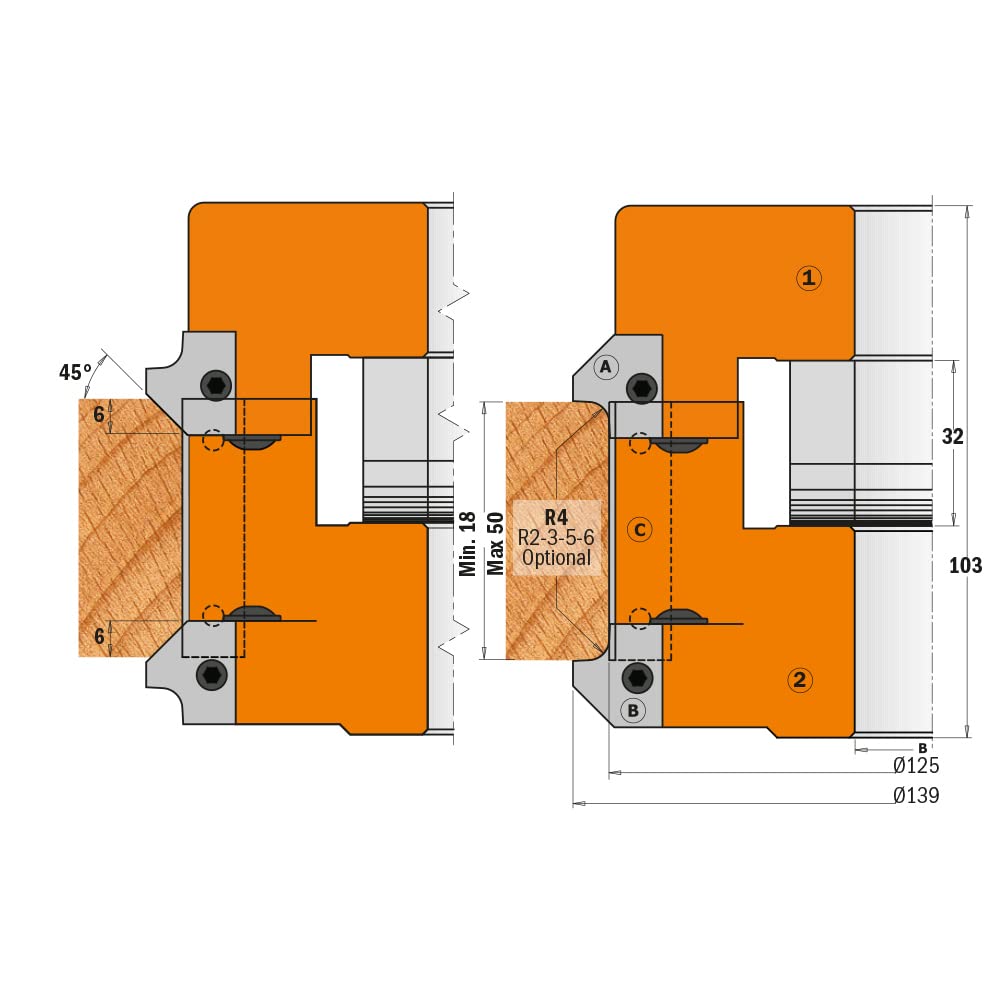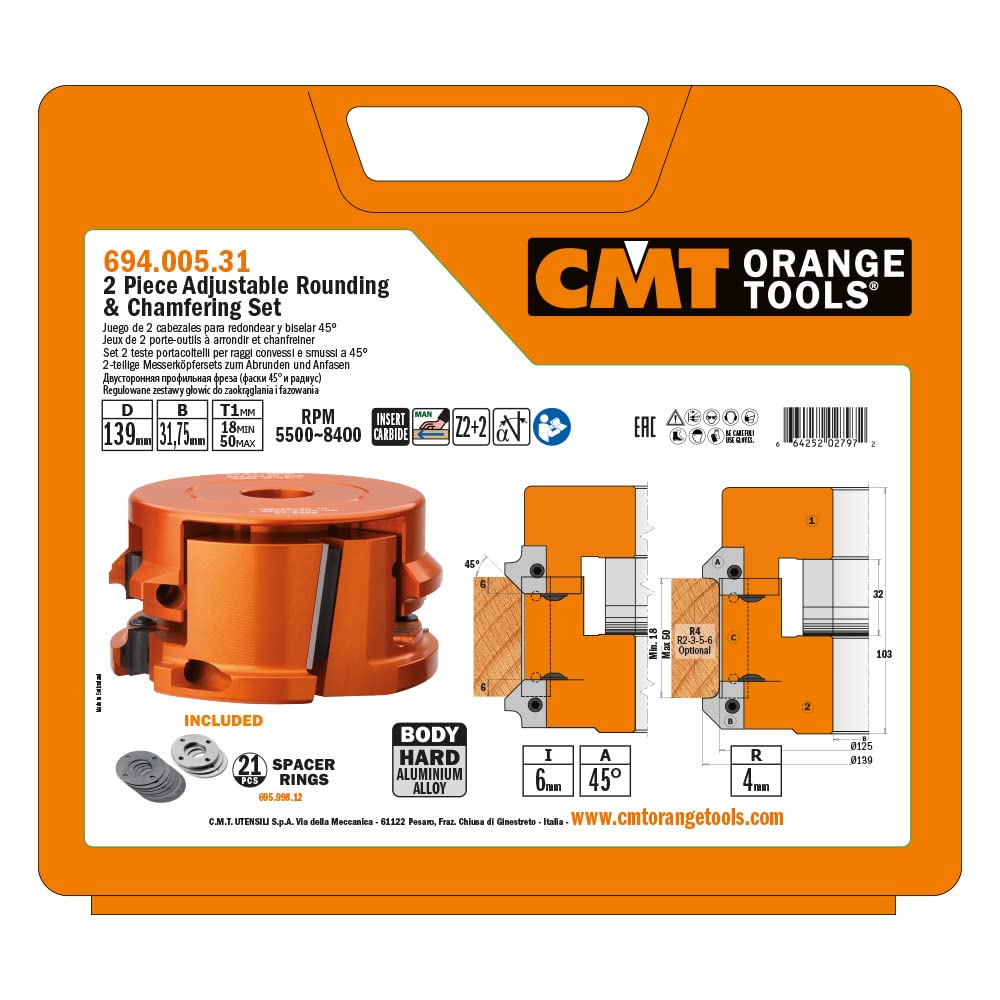 Details: The CMT adjustable rounding and chamfering set is a two piece set which are easy to set up in your shaper. The system allows you to round over both top and bottom edges in one pass with a radius of 5/64”, 1/8”, 5/32”, 3/16” and 15/64” and it allows 45 degree chamfering in material from 18mm to 50mm thick. The improved design with shear angle guarantees a perfect finish. Tool features heavy duty aircraft aluminum body, 2 solid carbide knives, 4 radius knives, 21 spacers, manual feed and pins for the automatic positioning of the knives.