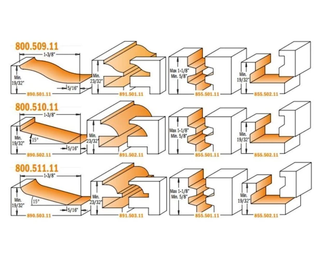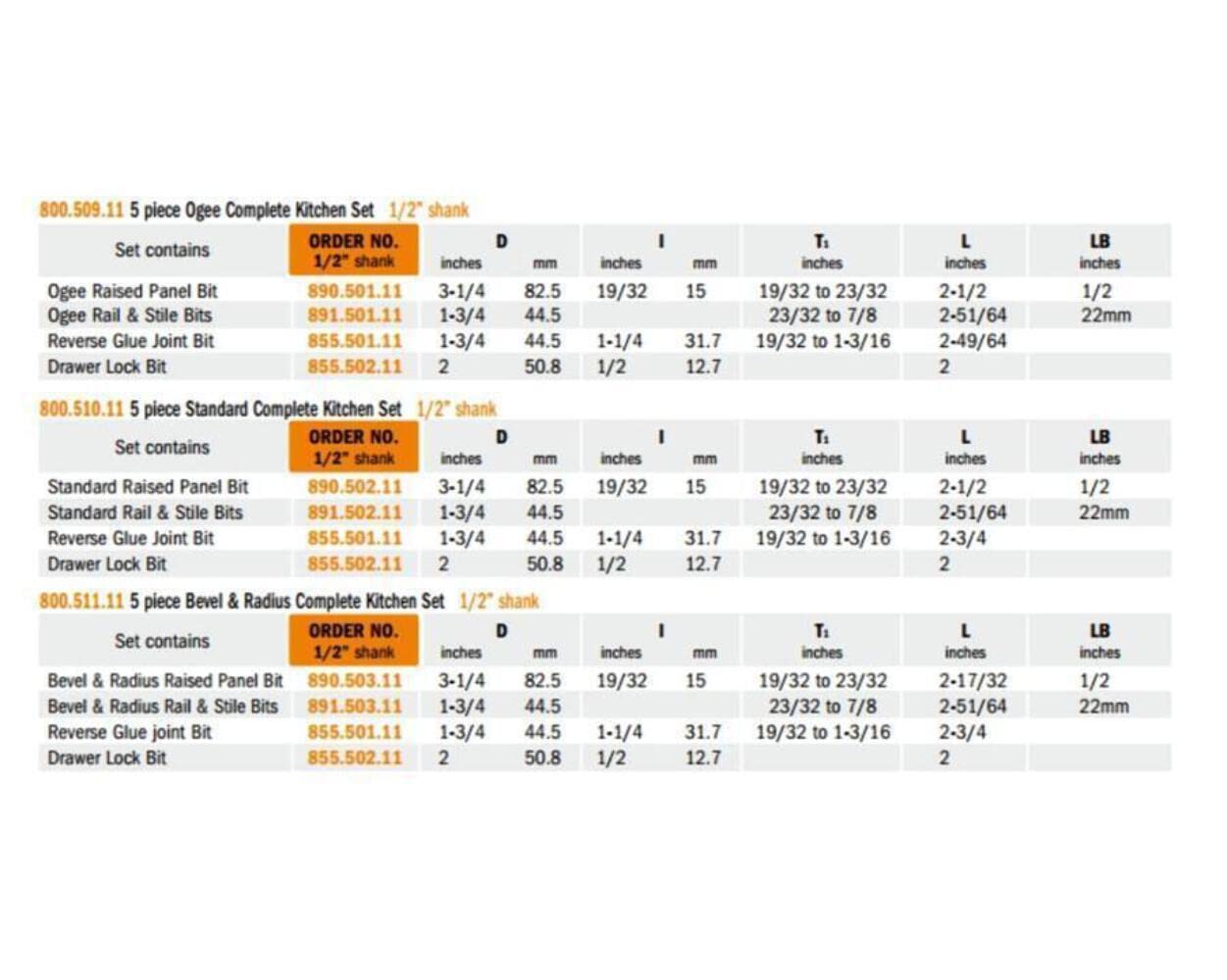 Details: Product Description Our sets aren't just a random selection of odds and ends bits packaged in a box to look nice - the CMT Complete Kitchen set is a professional drawer and door makers kit. We give you three sets to choose from for the profiles you prefer. Each set includes your choice of raised panel bit and Rail and Stile bit plus a glue joint and drawer lock bit. See illustrations below for complete profile options From the Manufacturer Our sets aren't just a random selection of odds and ends bits packaged in a box to look nice - the CMT Complete Kitchen set is a professional drawer and door makers kit. We give you three sets to choose from for the profiles you prefer. Each set includes your choice of raised panel bit and Rail and Stile bit plus a glue joint and drawer lock bit. See illustrations below for complete profile options