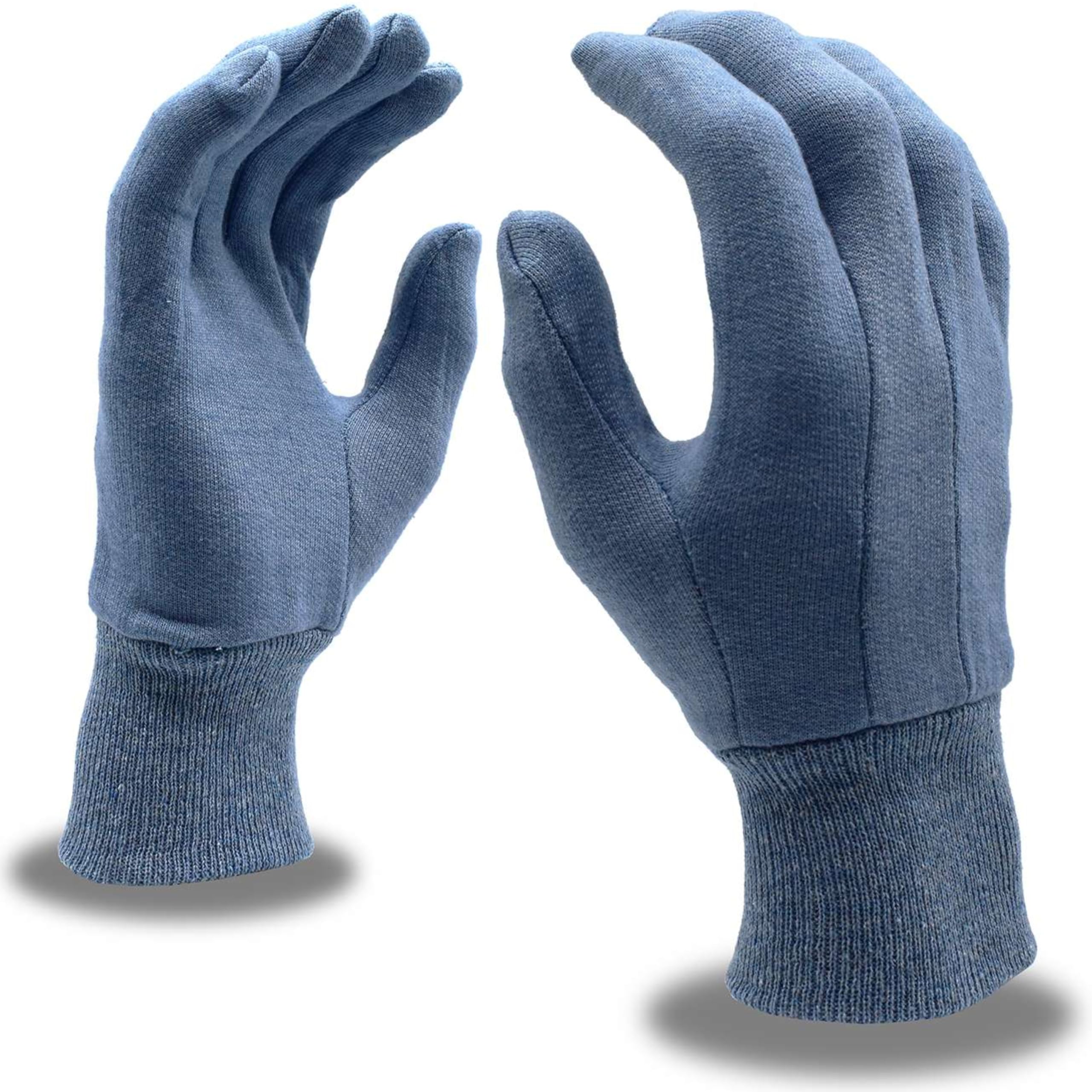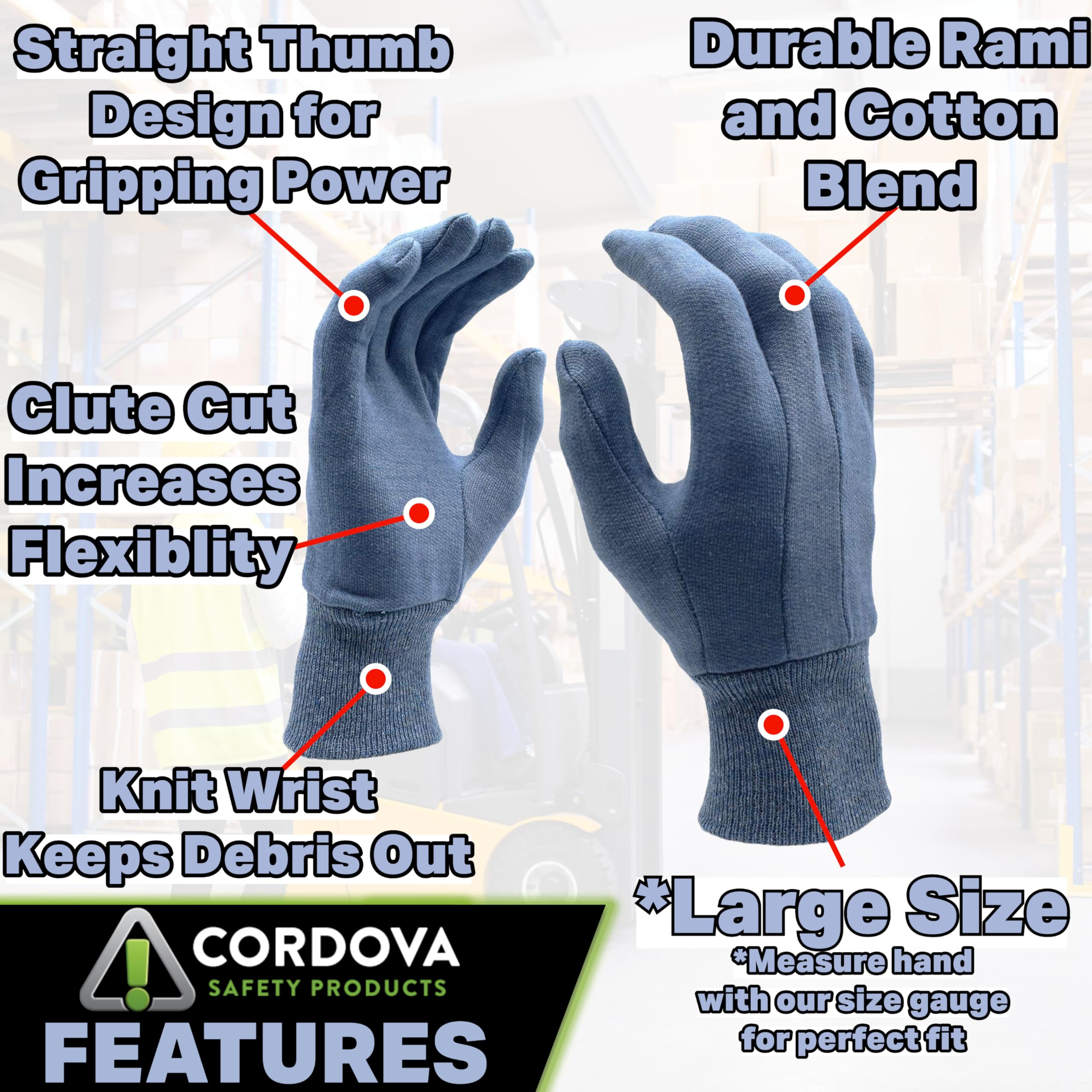 Details: Quick and easy to slip on, Cordova's blue heavyweight men's jersey gloves are perfect for a variety of general purpose applications, such as clean up and assembly work. These gloves are composed of a polyester and cotton blend and their knit wrists provide a secure fit that will lock out debris. Hand a pair out to your friends as they are sold by the dozen. (Size: Large).