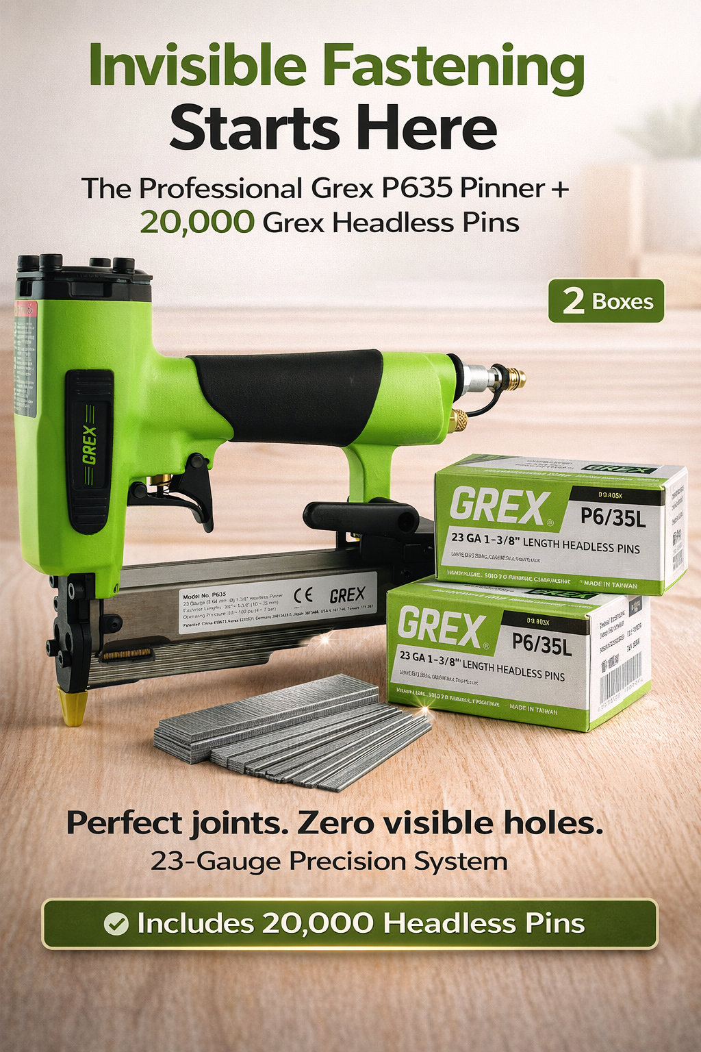 The Grex P635 23-Gauge Headless Pinner delivers ultra-clean fastening for trim, cabinets, crafts, and fine woodworking. Paired with Grex P6-35L 1-3/8″ headless pins, you get deep hold without visible nail holes — no filling, no sanding, no callbacks.