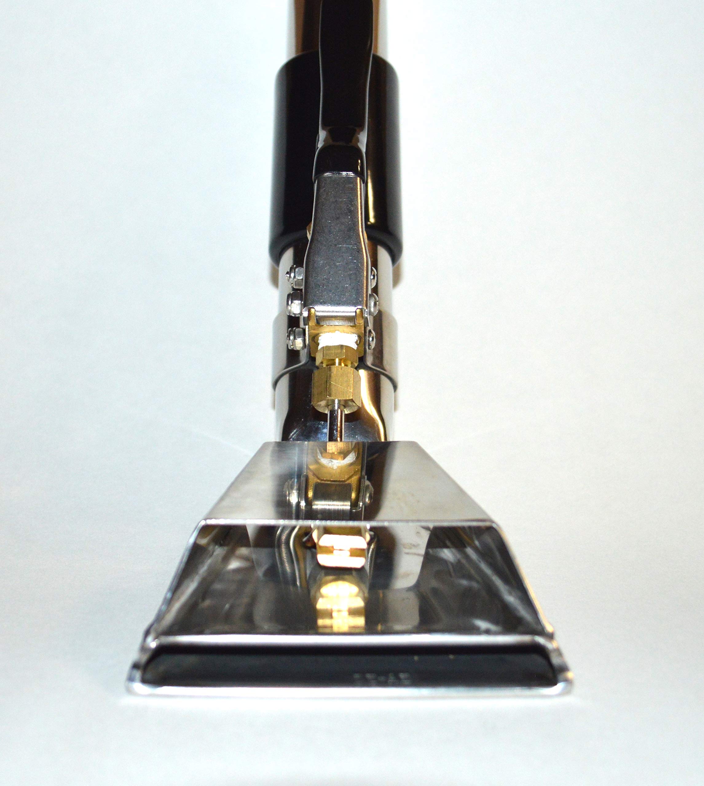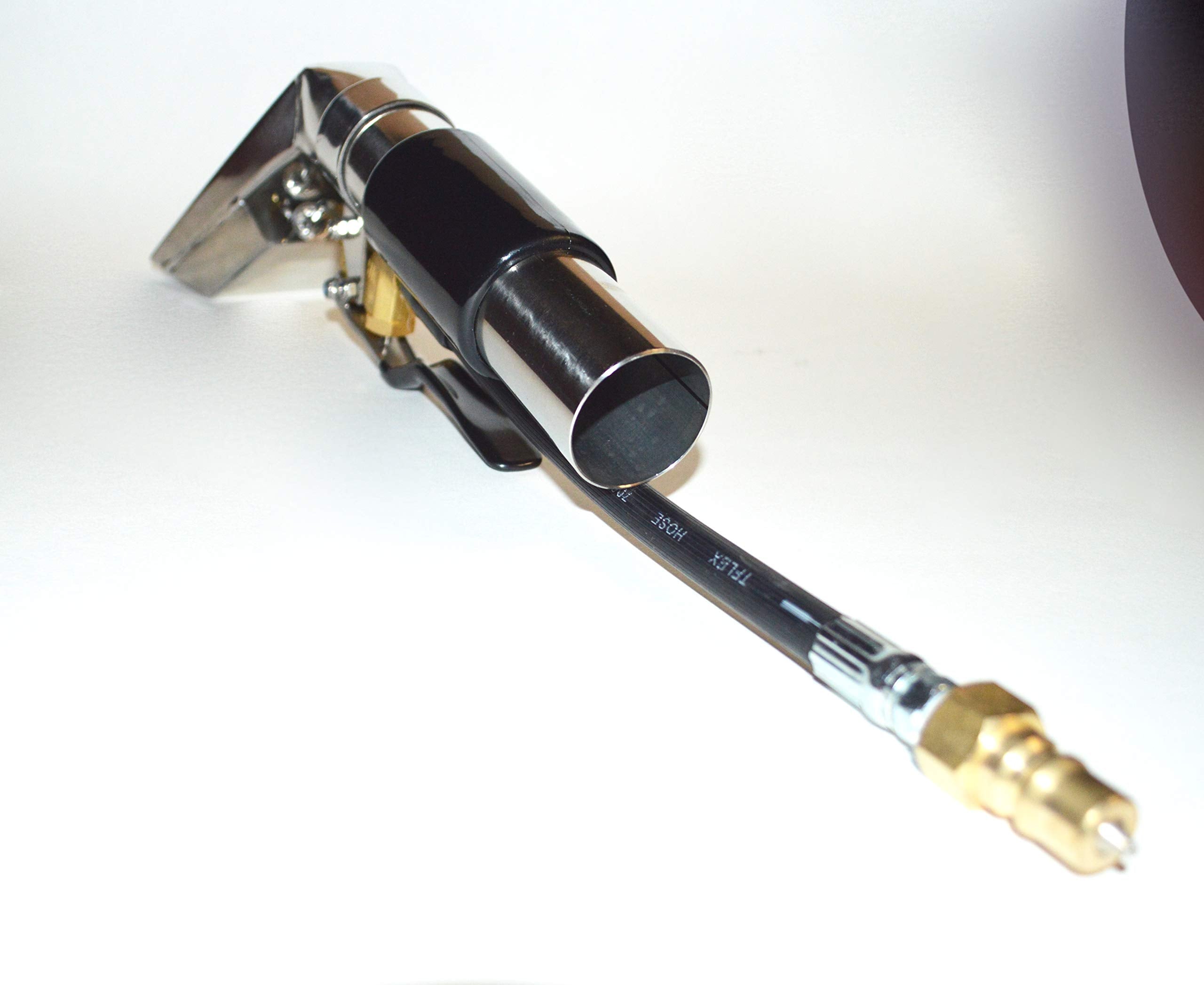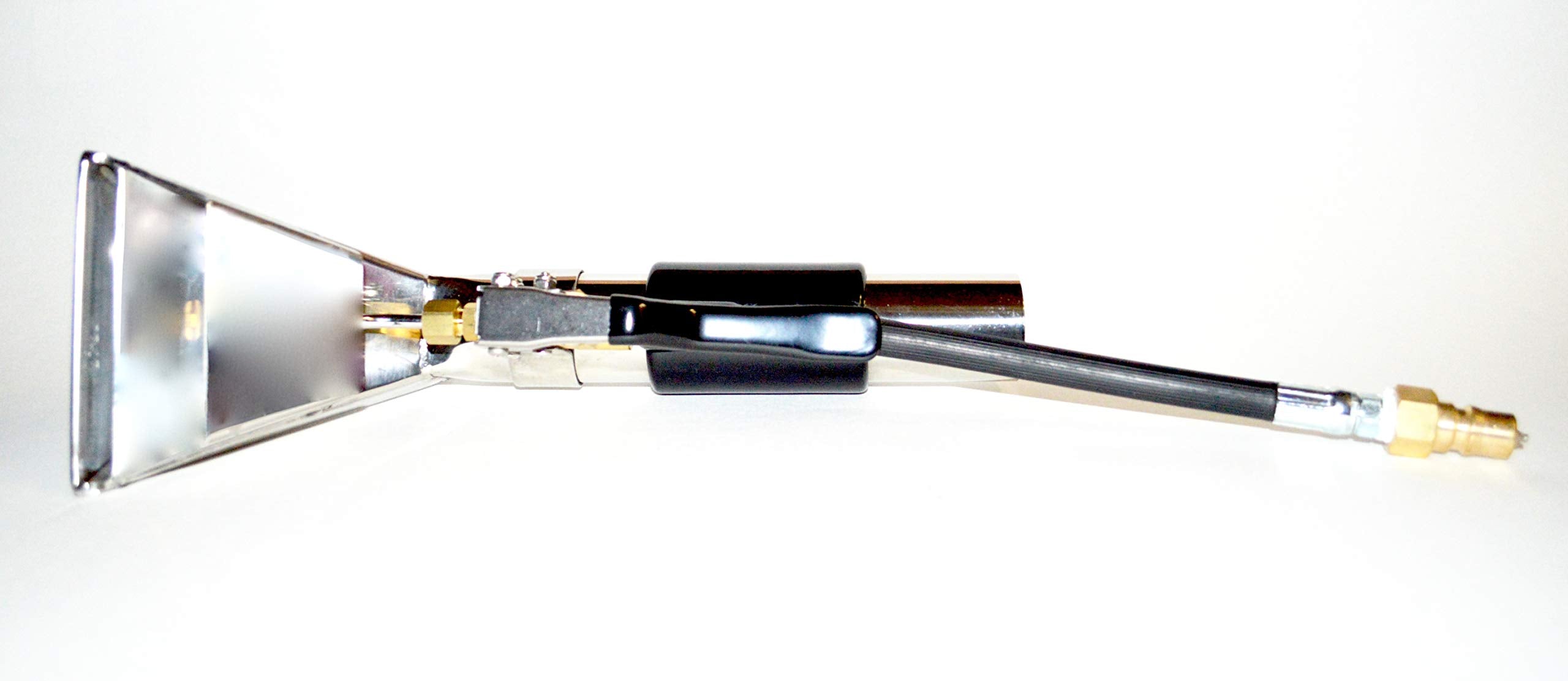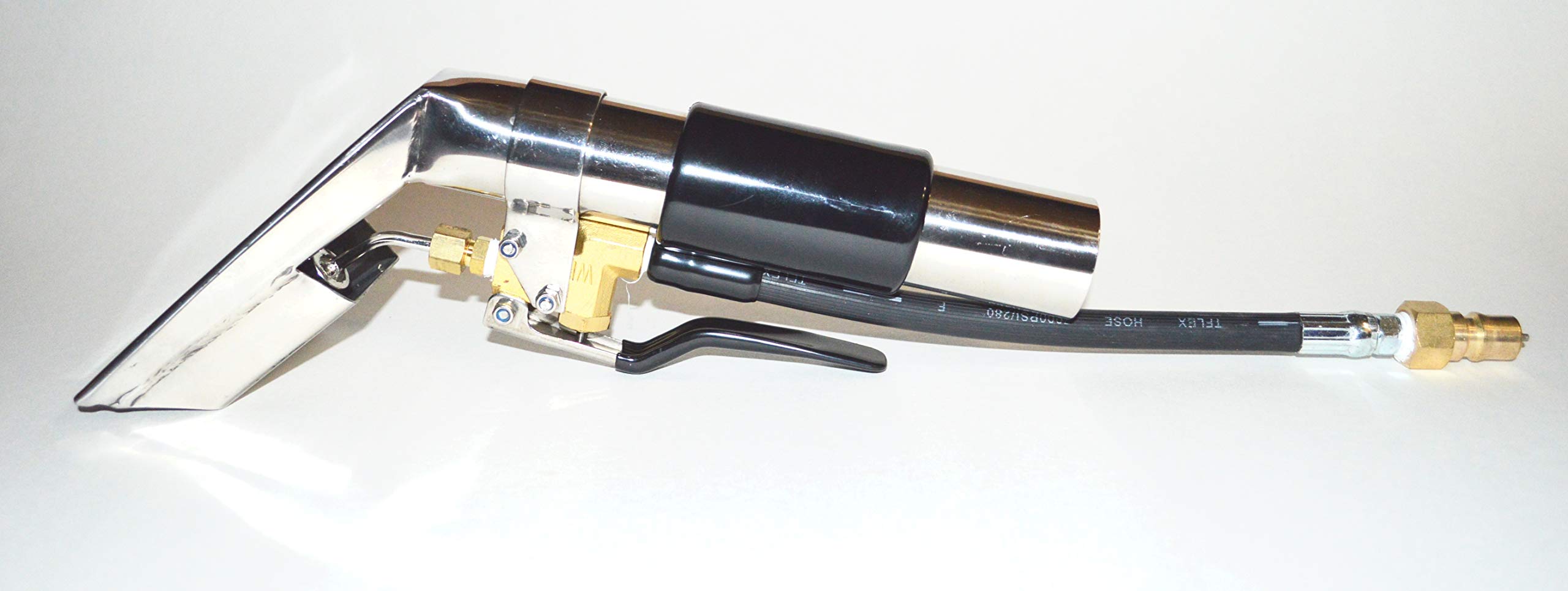 Details: • Forged brass control valve, rated at over 1200 PSI, with exclusive 'soft-opening' feature. • Vinyl covered handle for stress-free handling. • High pressure flex line with quick connect included. • Splashguard. • Polished stainless steel construction. • Easy access single nozzle, precise pattern. • Brass offset valve. • Nozzle 9502. • 1.5" Diameter Tube. • 4" Head Width. • 11" Length.